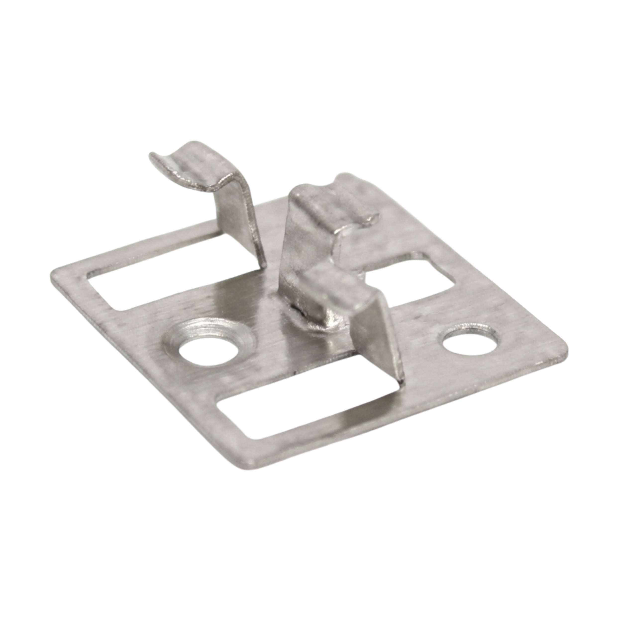 Clip de unión diseñado para fijar y separar correctamente las lamas de tarima tecnológica. Permite una instalación estable, uniforme y sin tornillería visible.
